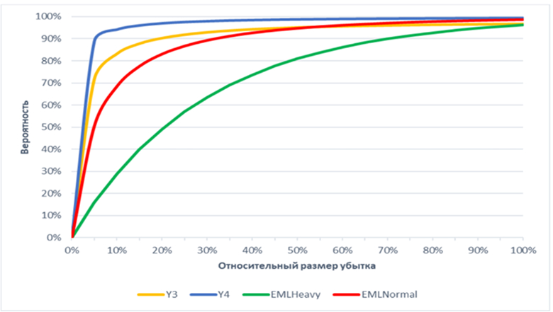 Распределения на рис.1.3 в целях наглядности показаны только на промежутке от 1% до 10%, с вероятностью более 90% размер ущерба по таким рискам не превышает 5% от максимальной суммы ответственности (TSI или EML). Такие распределения тяжести убытка характерны для крупных промышленных объектов, административных зданий, инженерных сооружений, страхования строительно — монтажных рисков (вне периода проведения пуско-наладочных работ), не включая строительную технику. Распределения подходят в случаях, если застрахованный объект представляет собой совокупность более мелких объектов, рассредоточенных по территории, например, отдельно стоящие цеха одного завода или корпуса имущественного комплекса.