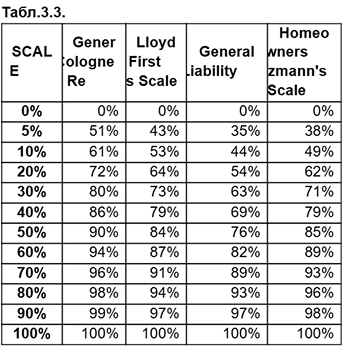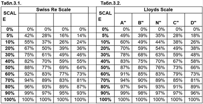 Серии шкал из Табл.3.2, 3.3. примерно соответствуют кривым, относящимся к распределениям MBBEFD: шкала А'' лежит между TSI Low и TSI Y4, шкала В'' – между TSI Y3 и TSI Low, шкала С'' – между TSI Heavy и TSI Y3, шкала D'' – между TSI Y1 и TSI Y2, а шкала N'' – близко к TSIY3. При этом поведение кривых по шкалам Ллойда вблизи точек x=0 и х=1 отличается от кривых, соответствующих распределениям MBBEFD TSIY1-Y3 — все Ллойдовские шкалы, включая шкалу D``, соответствуют рискам с низкой вероятностью тотальных убытков, близость шкал распределений MBBEFD и шкал Ллойда наблюдается более в области средних убытков.