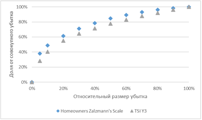 Рис.2. Кривая экспозиции для страхования домовладений от пожара по данным [4];[5] в сопоставлении со швейцарской кривой TSI Y3