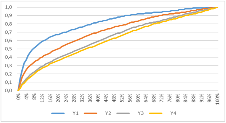 На рис.3–5 представлены графические изображения соответствующих зависимостей, которые в дальнейшем объединим общим названием R(X). Все упомянутые таблицы представляют дегрессивно возрастающие функции на промежутке от 0 до 1 и сходны по своей форме с функцией «эффекта высвобождения», описанной Т. Маком [1]. Однако обнаруженные нами таблицы, очевидно, содержат ошибки или неточности в названиях. В частности, таблицы, поименованные «швейцарскими кривыми» Y1-Y4, на самом деле ими не являются. Как показано в [2], более высокий номер кривой соответствует более удалённой от диагонали области, кривые TSI Y4 и TSI Y5 используются для крупных промышленных рисков с низкой вероятностью тотальных убытков. В собранных с рынка таблицах «швейцарских кривых» Y1-Y4 (Табл.3.1), напротив, чем выше номер кривой, тем ближе она к диагонали и тем выше вероятность тотальных убытков. Шкала Y1 (Табл. 3.1) находится фактически в области кривых TSI Y4 — EMLNormal, Y2 соответствует TSI Y3, Y3 лежит ближе к TSI Y2, а Y4 располагается между TSI Y1 и TSI Y2.