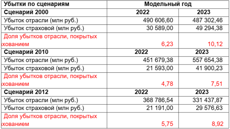 Ниже представлены результаты оценки ожидаемых убытков отрасли растениеводства и страховой отрасли: