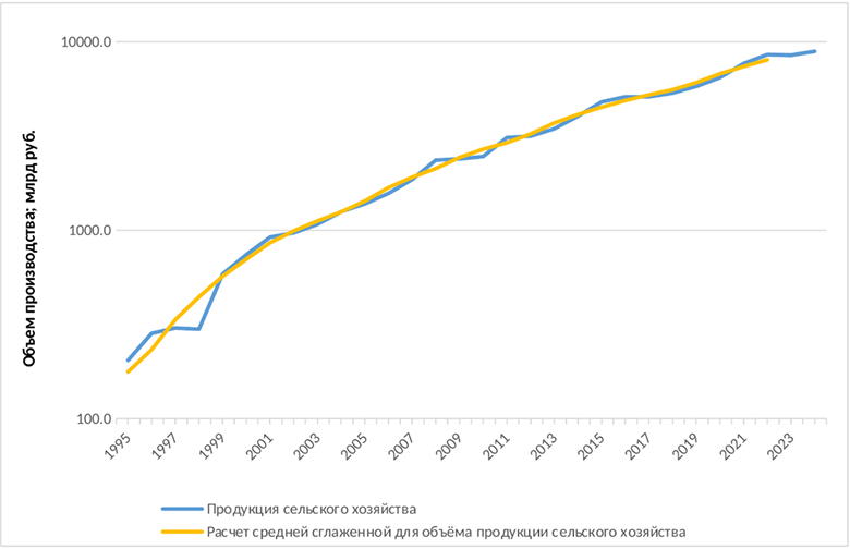 Результирующий график динамики объема производства сельскохозяйственной продукции и график сглаживающей функции представлены ниже. Шкала объема производства в рублях логарифмическая в трлн руб.