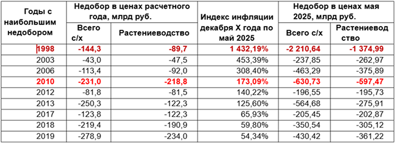Таким образом, в ценах 2025 года расчетный убыток от недобора продукции растениеводства в 2010 году (в условиях стабильной экономики и экстремально негативных природных факторов) достигает почти 600 млрд ₽ и 630 млрд ₽ в целом по отрасли. В 1998 году (в условиях воздействия макроэкономических факторов и одновременного действия негативных погодных факторов) расчетный убыток растениеводства в современных ценах превышает 1,3 триллиона рублей, совокупный убыток отрасли — более 2,2 триллиона рублей.